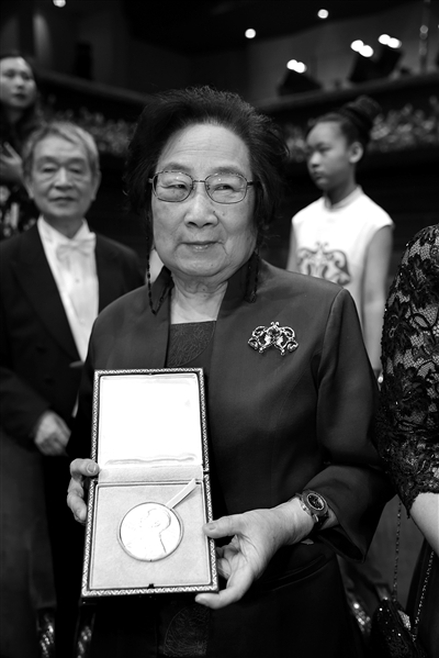 图一:12月10日,在瑞典首都斯德哥尔摩音乐厅举行的2015年诺贝尔奖颁奖仪式结束后,中国科学家屠呦呦展示获得的奖章。屠呦呦因在青蒿素研究中的杰出贡献,获得2015年诺贝尔生理学或医学奖,这是中国本土科学家首次获得诺贝尔自然科学奖项。新华社记者叶平凡摄
