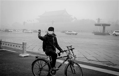图三:12月1日,京津冀地区遭遇强雾霾天气,一位市民在天安门前拍照,后方的天安门已“消失”在雾霾中。