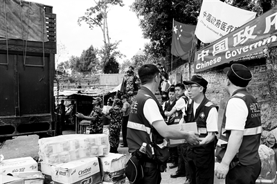 图五:4月27日,在尼泊尔杜力克市,中国政府医疗队队员与尼泊尔军方人员一起紧急卸载救援物资。