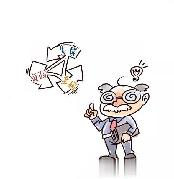衰弱是老年人失能的前兆,是介于生活自理和死亡前的中间阶段。衰弱的老人极易发生跌倒、疾病等,从而导致失能。研究表明,高龄、女性、慢性疾病、心力衰竭、抑郁、多药并用、独居、低收入和低教育水平的老年人是衰弱的易患人群。衰弱主要有五大表现:疲劳感、步速慢、肌无力、不明原因体重下降(1年内体重不明原因地下降超过5%的幅度)、低体能(体力活动减少)。对老年人进行衰弱评估,有助于预测老年人失能的发生。