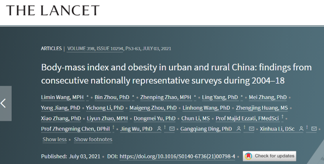 原文出处:Wang, Limin et al.Body-mass index and obesity in urban and rural China: findings from consecutive nationally representative surveys during 2004–18[J].The Lancet. July 03, 2021.DOI:https://doi.org/10.1016/S0140-6736(21)00798-4