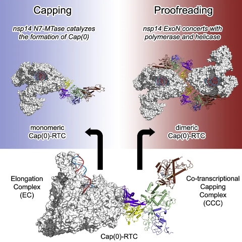 在目前已知的RNA病毒中,新冠病毒是基因组最庞大的一种,其负责转录复制过程的转录复制复合体是由十几种蛋白组装起来的一个复杂的分子机器。在过去对SARS病毒的研究中,科学家们就发现,冠状病毒有一个关键的蛋白,被称为nsp14,参与了加帽和复制矫正这两个关键过程。但这一个蛋白如何协同执行两个不同的生化过程,却成为近20年来的未解之谜。 这项研究中,为破解这一谜题,科学家们基于过去对加帽中间态RTC(即Cap(-1)’-RTC)、以聚合酶为中心的延伸复合体(EC)等工作机制的理解,首次成功组装了nsp10/nsp14复合物与Cap(-1)’-RTC形成的超级复合体Cap(0)-RTC,并确定了其三维结构。