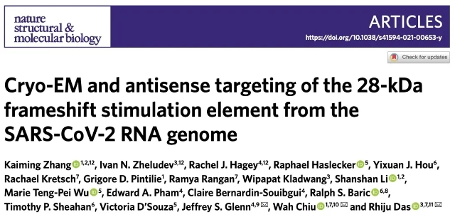 原文出处:Zhang K, Zheludev IN, Hagey RJ, et al. Cryo-EM and antisense targeting of the 28-kDa frameshift stimulation element from the SARS-CoV-2 RNA genome. Nat Struct Mol Biol. 2021 Aug 23. doi: 10.1038/s41594-021-00653-y. Epub ahead of print. PMID: 34426697.