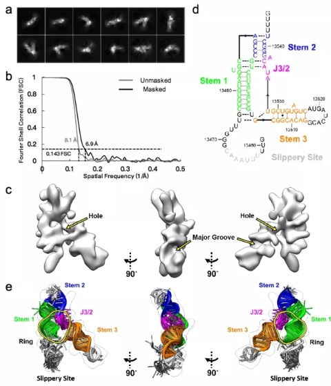 许多新冠病毒蛋白的三维结构已经被解析,大大促进了COVID-19靶向药物的研发进程。然而,我们对冠状病毒的了解还很有限,尤其是对RNA结构的认识还远远不够。已有研究显示,新冠病毒的5'UTR、3'UTR和移码元件(FSE)在病毒复制周期中起到至关重要的作用。FSE在开放阅读框ORF1a/ORF1b边界附近,可以使核糖体移码一个碱基,从而使其绕过ORF1a末端的终止密码子,进入ORF1b继续编码蛋白。病毒的RNA依赖性RNA聚合酶(RdRP)就是靠这种方式编码的。然而,FSE的三维结构尚不清楚,作用的分子机制也不明确。