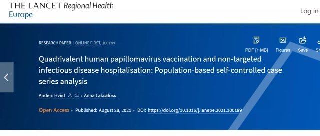 原文出处:Hviid, A., & Laksafoss, A. (2021). Quadrivalent human papillomavirus vaccination and non-targeted infectious disease hospitalisation: Population-based self-controlled case series analysis. The Lancet Regional Health-Europe, DOI: https://doi.org/10.1016/j.lanepe.2021.100189