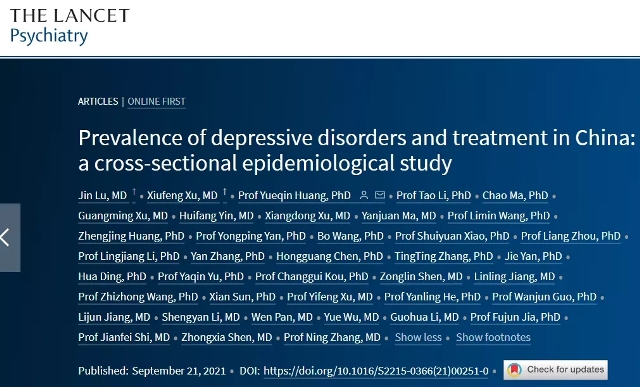 原文出处:Lu J, Xu X, Huang Y, Li T, Ma C, Xu G, Yin H, Xu X, Ma Y, Wang L, Huang Z, Yan Y, Wang B, Xiao S, Zhou L, Li L, Zhang Y, Chen H, Zhang T, Yan J, Ding H, Yu Y, Kou C, Shen Z, Jiang L, Wang Z, Sun X, Xu Y, He Y, Guo W, Jiang L, Li S, Pan W, Wu Y, Li G, Jia F, Shi J, Shen Z, Zhang N. Prevalence of depressive disorders and treatment in China: a cross-sectional epidemiological study. Lancet Psychiatry. 2021 Sep 21:S2215-0366(21)00251-0. doi: 10.1016/S2215-0366(21)00251-0. Epub ahead of print. PMID: 34559991.