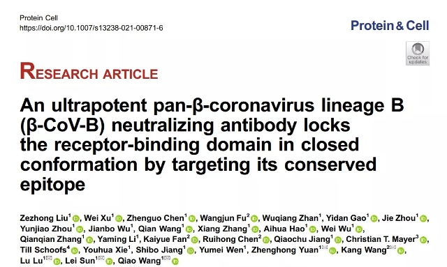 原文出处:Liu Z, Xu W, Chen Z, Fu W, Zhan W, Gao Y, Zhou J, Zhou Y, Wu J, Wang Q, Zhang X, Hao A, Wu W, Zhang Q, Li Y, Fan K, Chen R, Jiang Q, Mayer CT, Schoofs T, Xie Y, Jiang S, Wen Y, Yuan Z, Wang K, Lu L, Sun L, Wang Q. An ultrapotent pan-β-coronavirus lineage B (β-CoV-B) neutralizing antibody locks the receptor-binding domain in closed conformation by targeting its conserved epitope. Protein Cell. 2021 Sep 23:1–21. doi: 10.1007/s13238-021-00871-6. Epub ahead of print. PMID: 34554412; PMCID: PMC8458794.