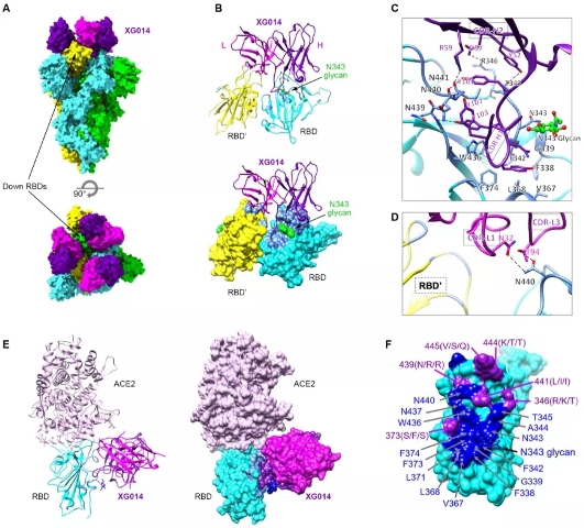 XG014不但可以强效地中和野生型SARS-CoV-2 (IC50: 0.007-0.008 μg/ml ),还对目前流行的SARS-CoV-2变异株包括Alpha、Beta、Gamma以及Delta的假病毒都展示了强效的中和作用(IC50: 0.017-0.059 μg/ml)。同时,XG014还可以强效地中和其它冠状病毒β属B亚群,对SARS-CoV的IC50为0.016 μg/ml。此外,XG014对蝙蝠来源的SARS相关病毒,例如WIV1和Rs3367假病毒,都展示了强效的广谱中和作用。结构分析表明,XG014与现有大部分报道的抗体作用机制不同,该抗体识别ACE2结合位点之外的一个非常保守的空间表位。通过结合该表位,XG014可将SARS-CoV-2 S蛋白三聚体中的三个RBD都锁定在“向下”的关闭状态,从而阻断SARS-CoV-2结合ACE2受体,抑制其入侵细胞。同时,通过比较XG014与目前报道的可锁定SARS-CoV-2 S蛋白为关闭状态的其它中和抗体,研究者发现XG014与这些抗体不同,具有独特的作用靶点。例如XG014同时具有强效广谱的中和活性、作用表位与ACE2的结合位点完全不重叠、作用表位不覆盖N501、E484以及K417等常见突变位点、能将三个RBD锁在“向下”的关闭状态、并同时结合两个RBD等。