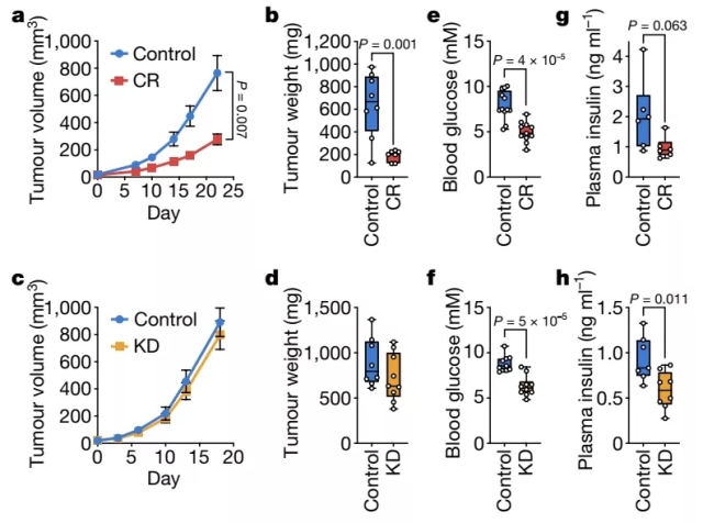 研究人员首先探讨了热量限制(CR)与生酮饮食(KD)对小鼠肿瘤生长的影响,发现在涉及不同组织的两种癌症模型中,肿瘤生长不受KD影响,只有CR抑制肿瘤生长。两种饮食都会导致血糖水平类似的降低。此外,只有KD显著降低空腹血浆胰岛素水平,尽管CR导致胰岛素水平下降。因此,CR对肿瘤生长的影响可能不能完全用血糖和胰岛素的降低来解释。