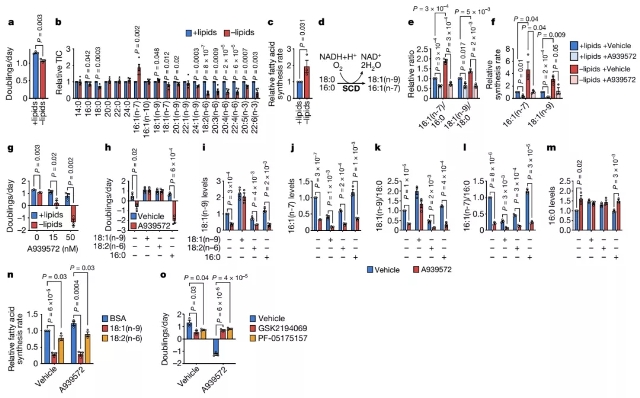 有趣的是,在脂质耗尽条件下培养的细胞中,16:1(n-7)MUFA水平显著增加。硬脂酰辅酶A去饱和酶(SCD)分别负责从16:0和18:0 SFA合成16:1(n-7)和18:1(n-9)MUFA。16:1(n-7)/16:0和18:1(n-9)/18:0的比例,作为SCD活性的替代物,在脂饥饿细胞中显著增加,而SCD抑制剂A939572则降低。一致地,脂质饥饿的细胞通过SCD表现出增加的通量,并且SCD抑制仅在所有受试细胞的脂质耗尽培养基中损害增殖,并诱导细胞死亡。因此,当外源性脂质含量较少时,这些癌细胞需要上调SCD活性。进一步探究SCD抑制对细胞的毒性作用发现,尽管SFA积累在SCD抑制后诱导细胞死亡中具有重要意义,但仍需要通过SCD活性获取不饱和脂肪酸以实现最佳的脂质饥饿癌细胞增殖。