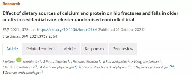 [1] Iuliano, S., Poon, S., Robbins, J., Bui, M., Wang, X., De Groot, L., ... & Seeman, E. (2021). Effect of dietary sources of calcium and protein on hip fractures and falls in older adults in residential care: cluster randomised controlled trial. bmj, 375.