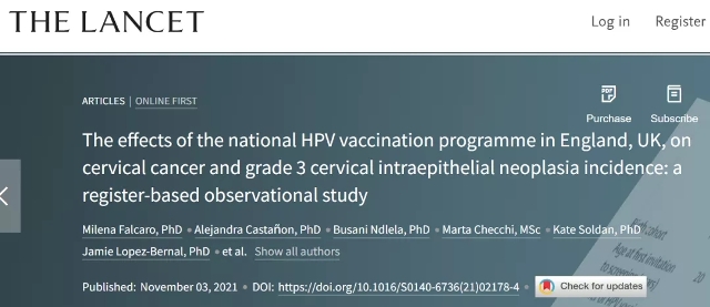 2021年11月3日,国际著名医学期刊《柳叶刀》(The Lancet)重磅刊登了来自英国全国层面的大型人群队列研究数据。该研究基于英国“12-13岁”、“14-16岁”、“16-18岁”3个不同年龄队列女孩的数据,证实了接种HPV疫苗可减少多达87%的宫颈癌以及多达97%的宫颈上皮内瘤变3级(CIN3)。在1995年9月1日之后出生的女性中,HPV接种已经几乎消除当地女性的宫颈癌!