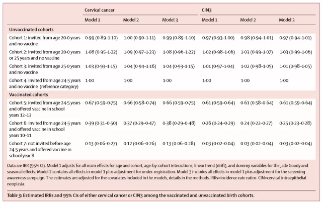 当前这项观察性研究采用了英国人群癌症登记数据,通过建模控制混杂因素和偏倚,对接种二价疫苗的3个年龄队列(接种时分别为12-13岁、14-16岁以及16-18岁)女孩以及英国启动HPV疫苗接种计划前女性(4个队列组)的发病率数据进行了比较。研究期间(2006年1月1日至2019年6月30日)共有27946例患者被确诊为宫颈癌,318058例患者被确诊为CIN3。在“12-13岁”、“14-16岁”、“16-18岁”三个疫苗接种队列中,研究随访时间共长达1370万-年。